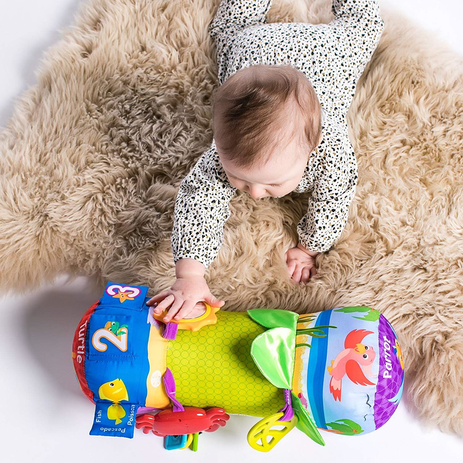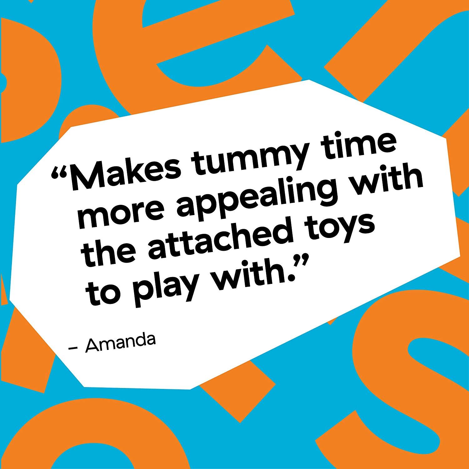 With so many baby activity toys attached to this comfortable prop pillow, you can extend important tummy time to encourage head and neck muscle development.